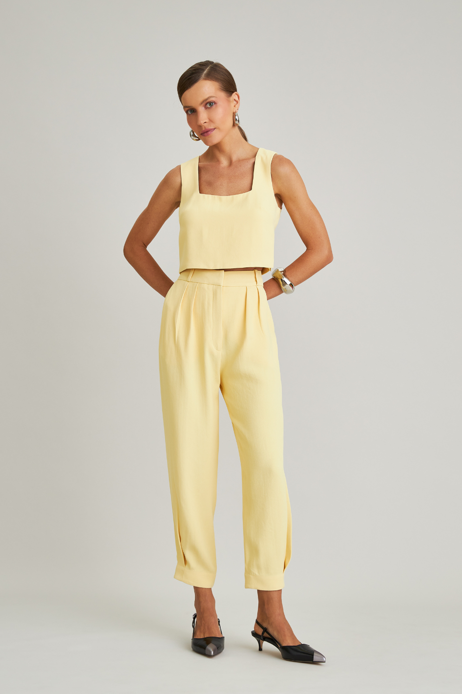A Blusa Cleo contém decote quadrado que valoriza o colo, alças largas que além de confortáveis trazem sofisticação a peça e pences nas laterais que dão estrutura ao modelo, podendo compor diversos looks sem perder a elegância e conforto.