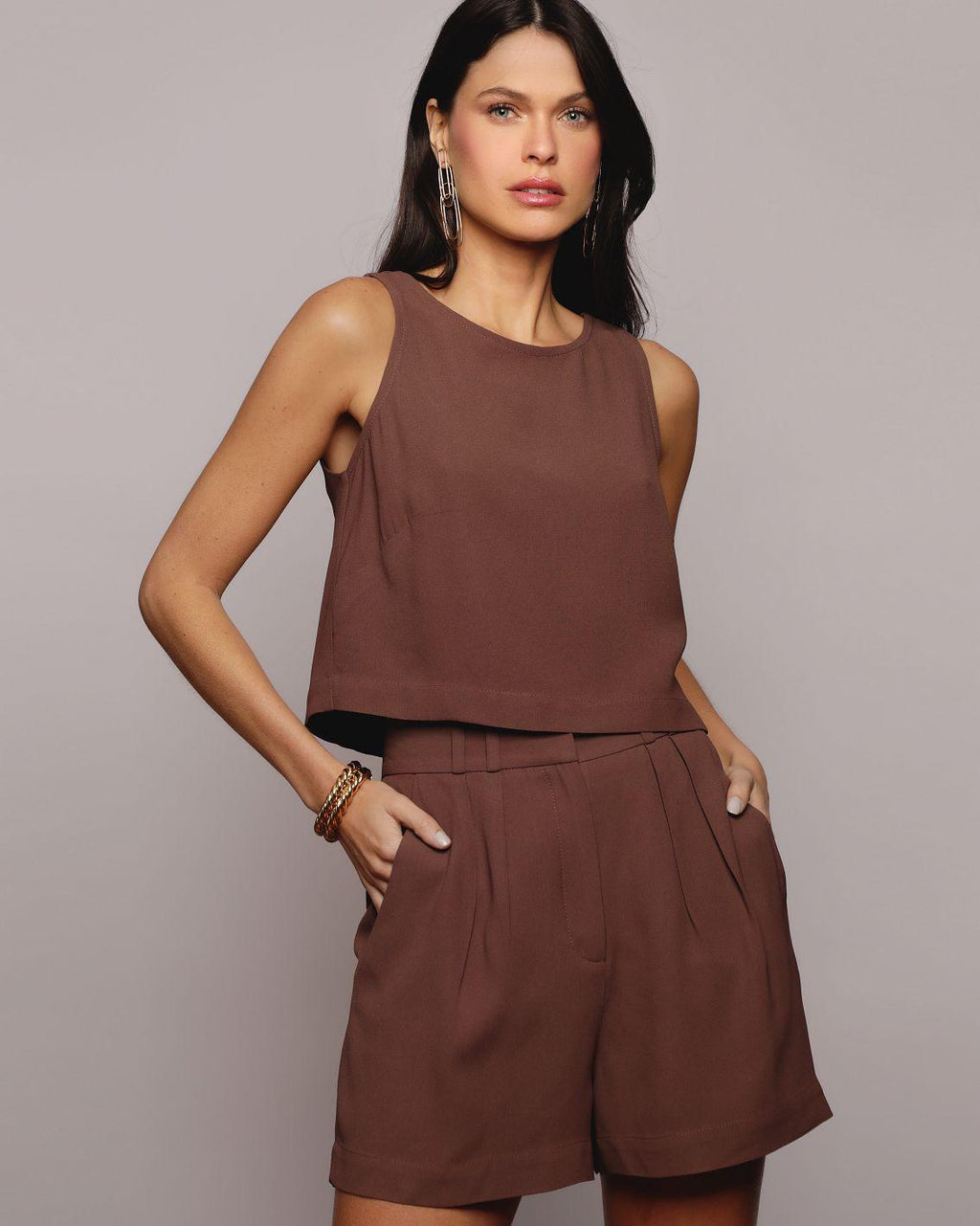 A Blusa de Alfaiataria Gabi Marrom contém decote redondo na frente e quadrado nas costas com alças largas podendo ser usado também com sutiã, contém recorte nas costas que traz modernidade a peça, além de duas pregas nas laterais para dar mais estrutura ao modelo, trazendo elegância e praticidade.