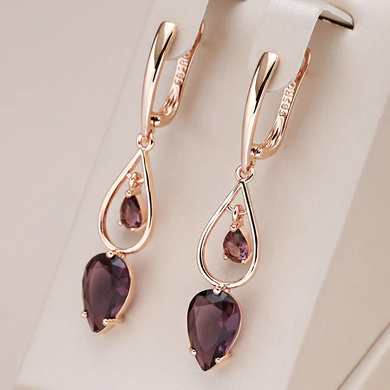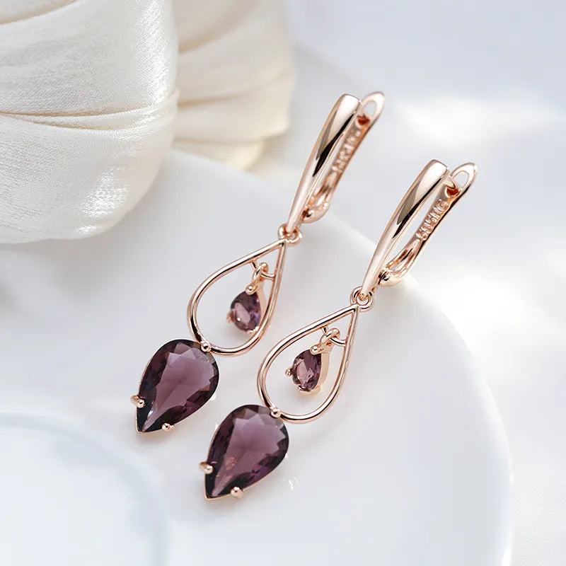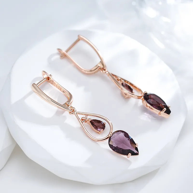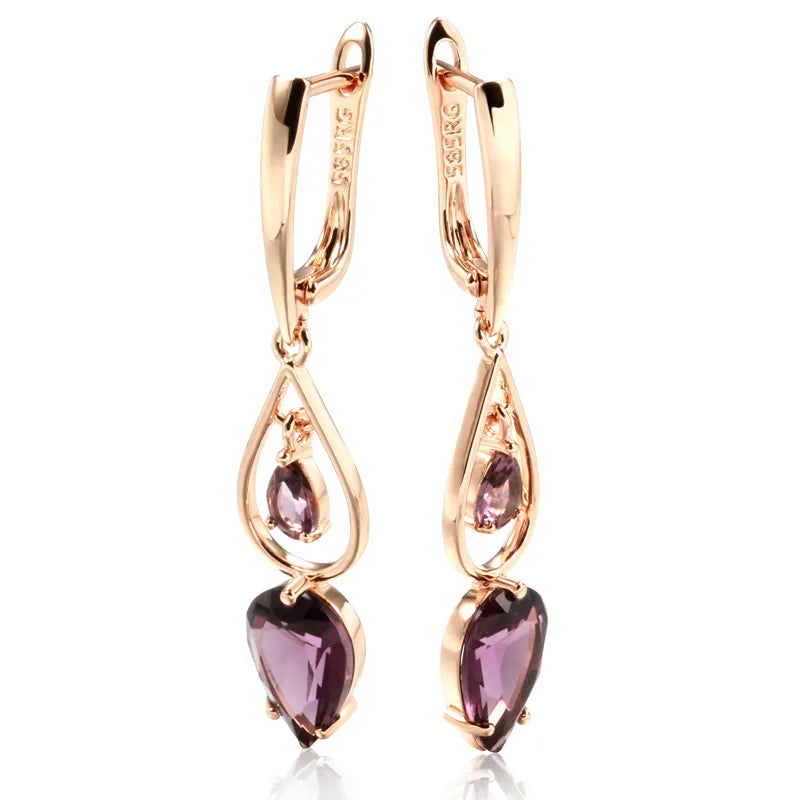 Este brinco apresenta um design delicado e elegante, onde o destaque é uma pedra violeta cuidadosamente lapidada e cravada no centro do brinco. A pedra violeta é frequentemente uma ametista ou uma pedra similar, escolhida por sua cor rica e profunda que evoca um senso de elegância e mistério.