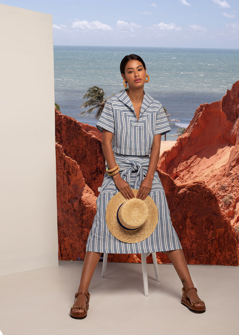 Saia midi com modelagem evasê. Detalhe para amarração frontal do próprio tecido.