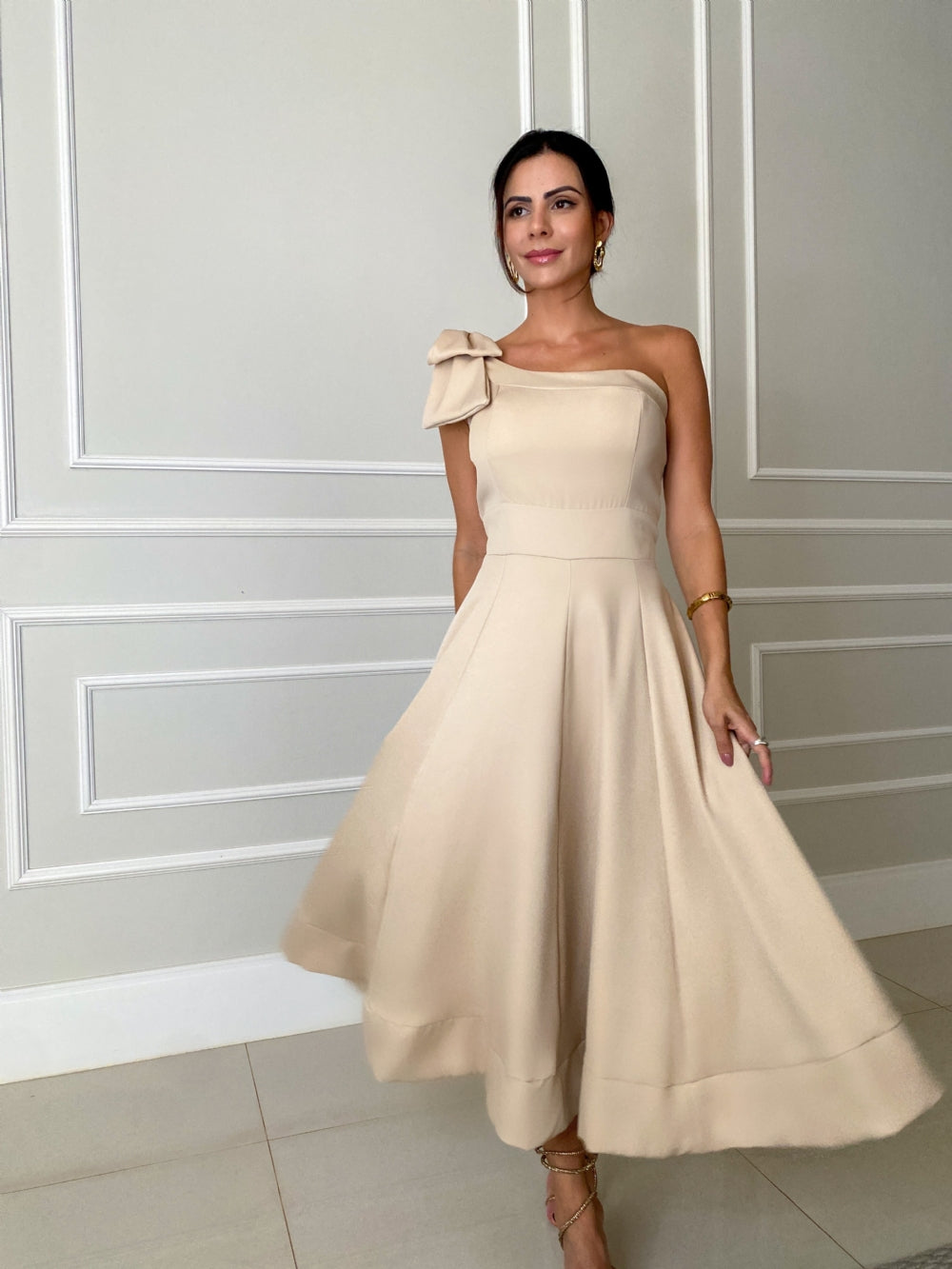 Vestido clássico e sofisticado!Vestido midi, nula manga com detalhe em laço, decote quadrado com bojo, comprimento da saia amplo, fechamento em zíper na parte de trás. Possui forro Tecido: Crepe alfaiataria
